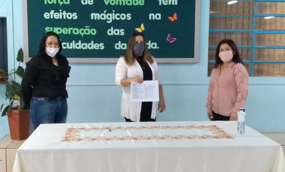 A assinatura do contrato aconteceu na última quinta-feira (25), nas dependências do colégio, com a presença da diretora Diani Bohler Piccoli e da diretora auxiliar Marizete B. Senkovski, de Fabiano Bedin, representante da empresa executora da obra, da vereadora e documentadora escolar do Núcleo Regional de Educação de Francisco Beltrão, Érica do Nascimento – que também estava representando o deputado estadual Wilmar Reichembach, cuja articulação política junto à Fundepar foi fundamental para a viabilização da verba –, do prefeito Moacir Fiamoncini, da secretária municipal da Educação, além de demais funcionários do estabelecimento de ensino, do Núcleo Regional de Educação de Francisco Beltrão e do presidente da APMF.